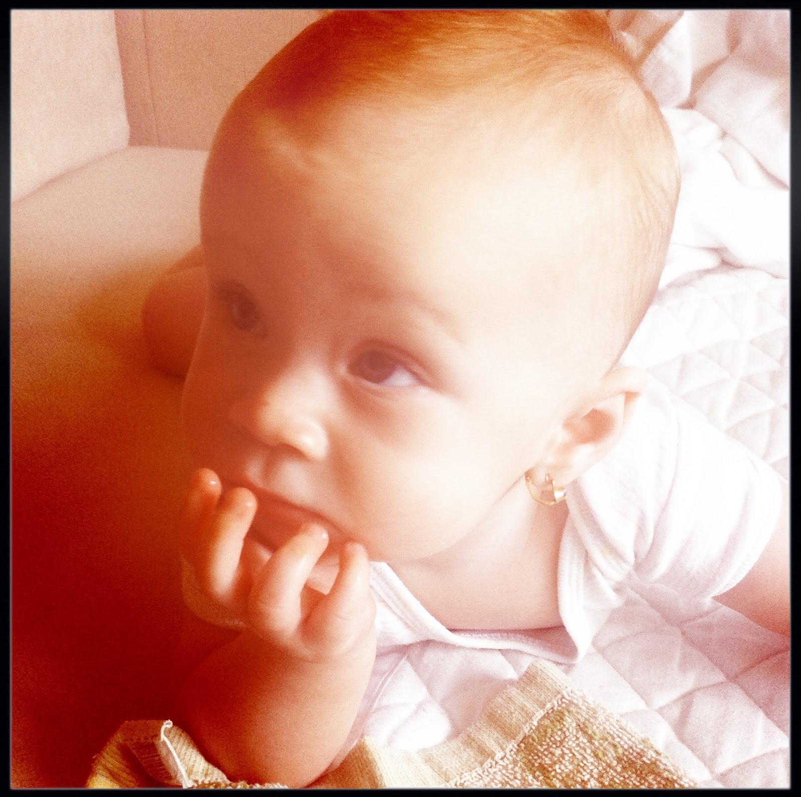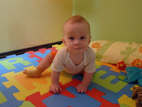 Mostanra már szinte állandóan négykézláb van. Már-már azt várom, mikor mászik ki utánam a konyhába, mert folyamatosan szaszerol, ha kimegyek a szobából. Nagyon kis huncut, sokat nevet és dumál.