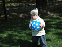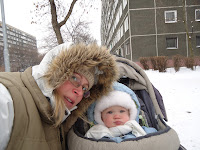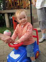 És hát persze folyamatosan rajzolunk. Egyre több időt tölt el az asztalnál, szerencsére Nimród etetése közben is el tudja foglalni magát (persze nem mindig) és hát a gyurma is előkerült, de azt még egyelőre inkább csak csipegeti, bár már próbálta utánozni, ahogy gömböt - szerinte labdát :-) - csinálok. A rajzok persze korának megfelelően inkább hatalmas ívű vonalak sokasága, de ha pl. egy post-it-et adok neki, akkor koncentráltan benne marad és ritkán szalad túl a papíron - ami lássuk be, nem egyszerű még ebben a korban -. Készítettem memóriakártyát is neki, magam rajzoltam különböző figurákat kartonpapírra. Ezekkel is sokat játszunk, bár még nem teljesen rendeltetésszerűen, inkább a szavakat tanuljuk. És hát a betűk... Izé..., szóval az van, hogy ismeri a betűket. Az úgy kezdődött, hogy ahhoz, hogy megtanítsam neki az Apa szót (mert mi mást is taníthat egy Édesanya elsőként, ugye?), megmutattam neki az "A" betűt a habtapin. Azt még csecsemő korában vettük, hogy majd egyszer hasznos lesz - nem gondoltuk, hogy ilyen korán -, és a választék akkor nem volt túl nagy és hát Disney-vel nem akartuk még kábítani. Szóval megtanulta az "Apa-betűt". Aztán kérdezősködött tovább, illetve hogy a kis barátai nevét is megtanulja, elneveztem pl. a "B" betűt Barnus-betűnek, a "D" betűt Dávid-betűnek és az "E" betűt Eszter-betűnek és így tovább. Mára ott tartunk, hogy ha megyünk sétálni, megáll a parkoló autók mellett és elolvassa a rendszámokat. Pl.: a mi autónk rendszáma LEV-..., ami az ő olvasatában: labda-Eszter-vonat. És ugyanez a helyzet a bolti feliratokkal, plakátokkal vagy bármivel, ahol szöveg van. Először azt hittem, hogy Apa-mániás, mert már a SPAR felé haladva üvöltötte, hogy Appppaaaa, én meg mondtam neki, hogy Apa dolgozik, csak később jön haza, mire egyszer csak mondja, hogy séta... és mutat felfelé és így vettem észre, hogy a SPAR-t betűzi. Szóval ez van. Nem hinném, hogy zseni, inkább csak ez érdekli, illetve hát mit tagadjam, azért jól vág az esze és nagyon gyorsan megjegyzi azt, ami érdekli. Úgy fest, szerencséje van és Apukájától nem csak a göndör fürtjeit, hanem a fotómemóriáját is örökölte és hát reméljük a későbbiekben is hasznát tudja majd venni ennek.